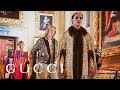 Unfolding inside seven rooms of the Palatine Gallery in Pitti Palace, the Gucci Cruise 2018 collection by Alessandro Michele was woven with a Renaissance influence. Gowns with crystals, pearls or bows worn with elaborate hand bracelets. Lapels on men’s brocade suits pinned with three dimensional brooches of faces from Greek mythology: Silenus, the companion of Dionysus and Hercules, the son of Zeus. A new way of writing the House name—Guccy, Guccify and Guccification—found by Alessandro Michele through tags on Instagram, appeared on ready-to-wear and bags. Accessories crafted in retro shapes featured GG and butterfly hardware, and gold laurel crowns—evoking the goddesses of old Hollywood—were carried by hand or circled the models heads.